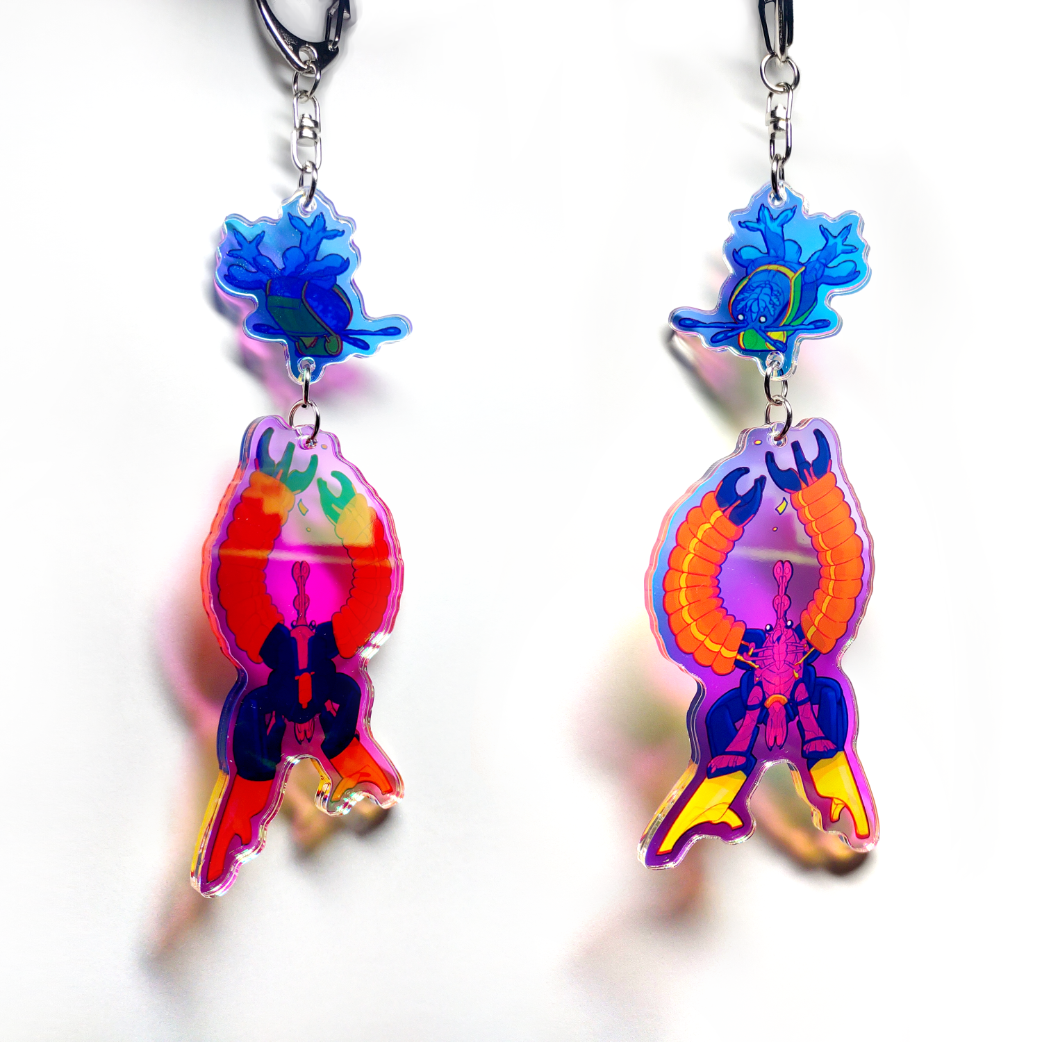 A 5 inch tall, two piece acrylic keychain with Tango throwing Swing into the air using a robotic exosuit. Comes with a protective peel-off plastic coating on both sides of the acrylic.