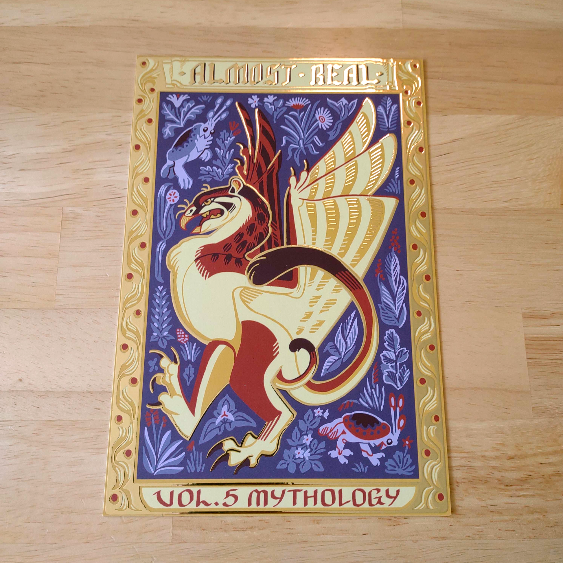 A print of Almost Real Volume 5's tapestry-style illustration of the marsupial griffin, with Tango and Swing the scuds frolicking in the background. A joey tail can be seen poking out of the mama griffin's rear-facing pouch!