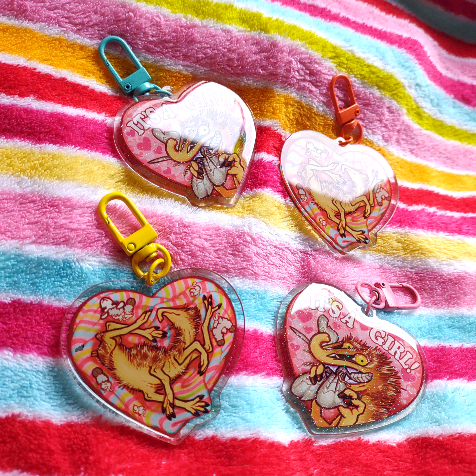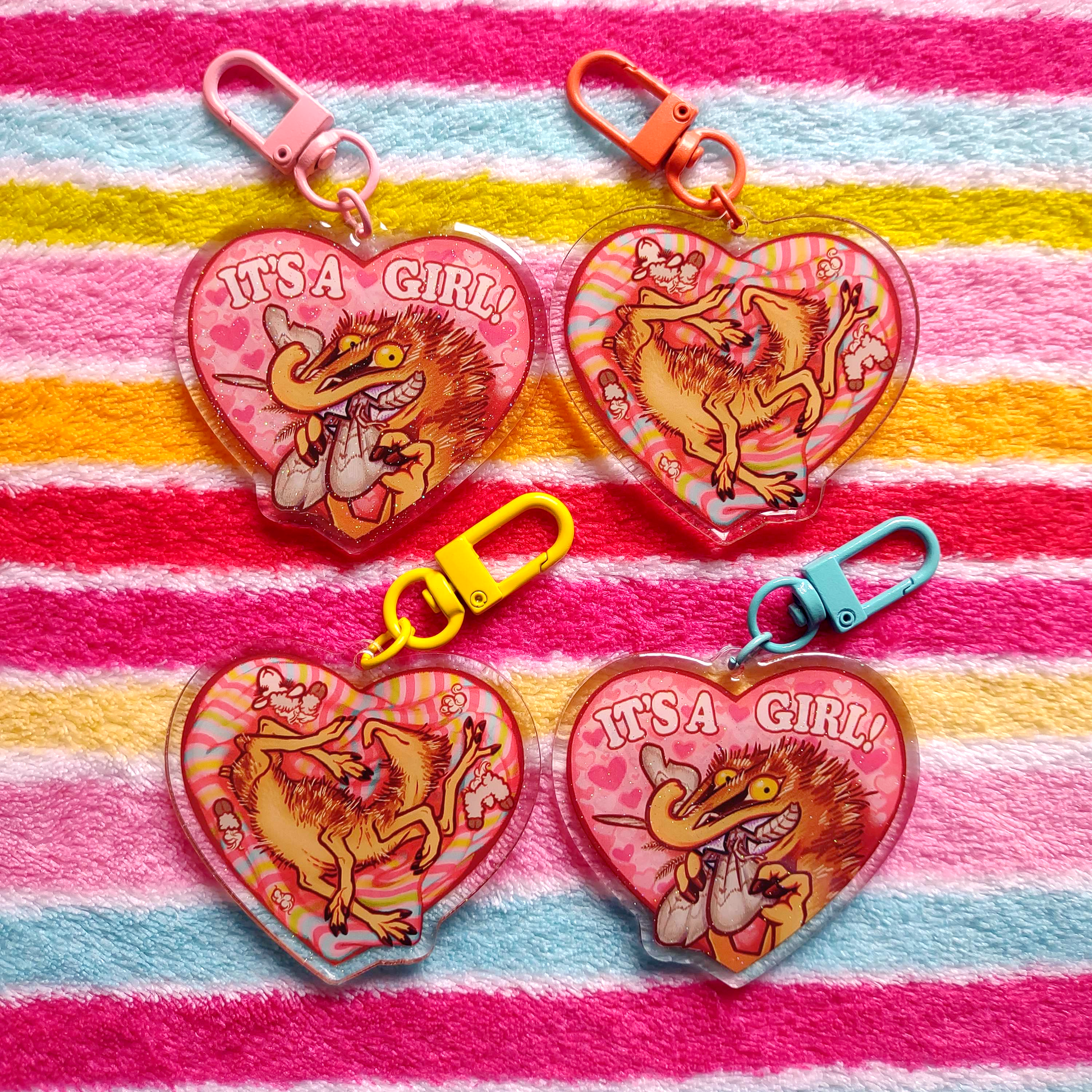 This keychain is 2.25 by 2 inches and features glitter epoxy on the "IT'S A GIRL" side. There are 4 different options for the clip, because I am indecisive and love bright colors.