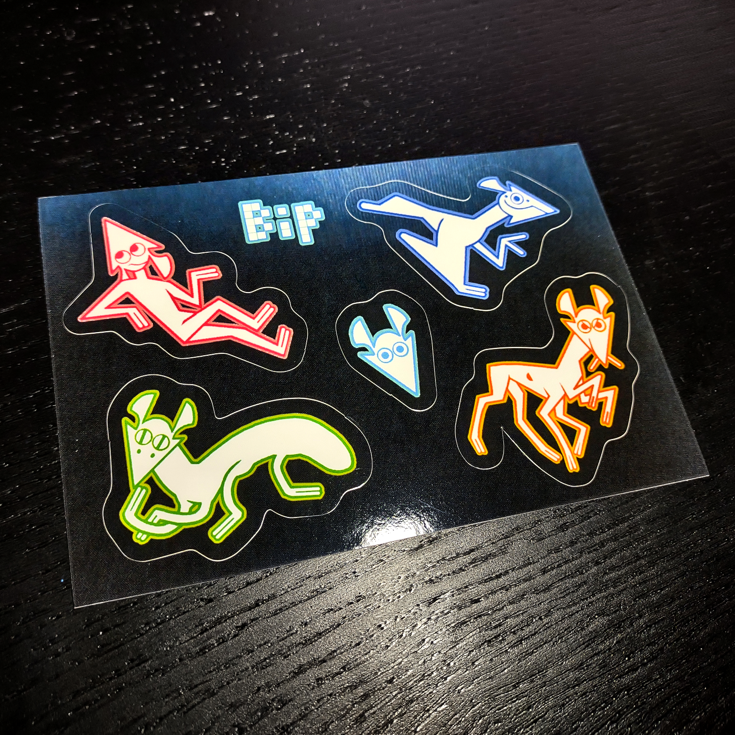 A high quality screen-printed sticker sheet featuring the Bip, the shady pilot A.I. of the titular spaceship of Runaway to the Stars.