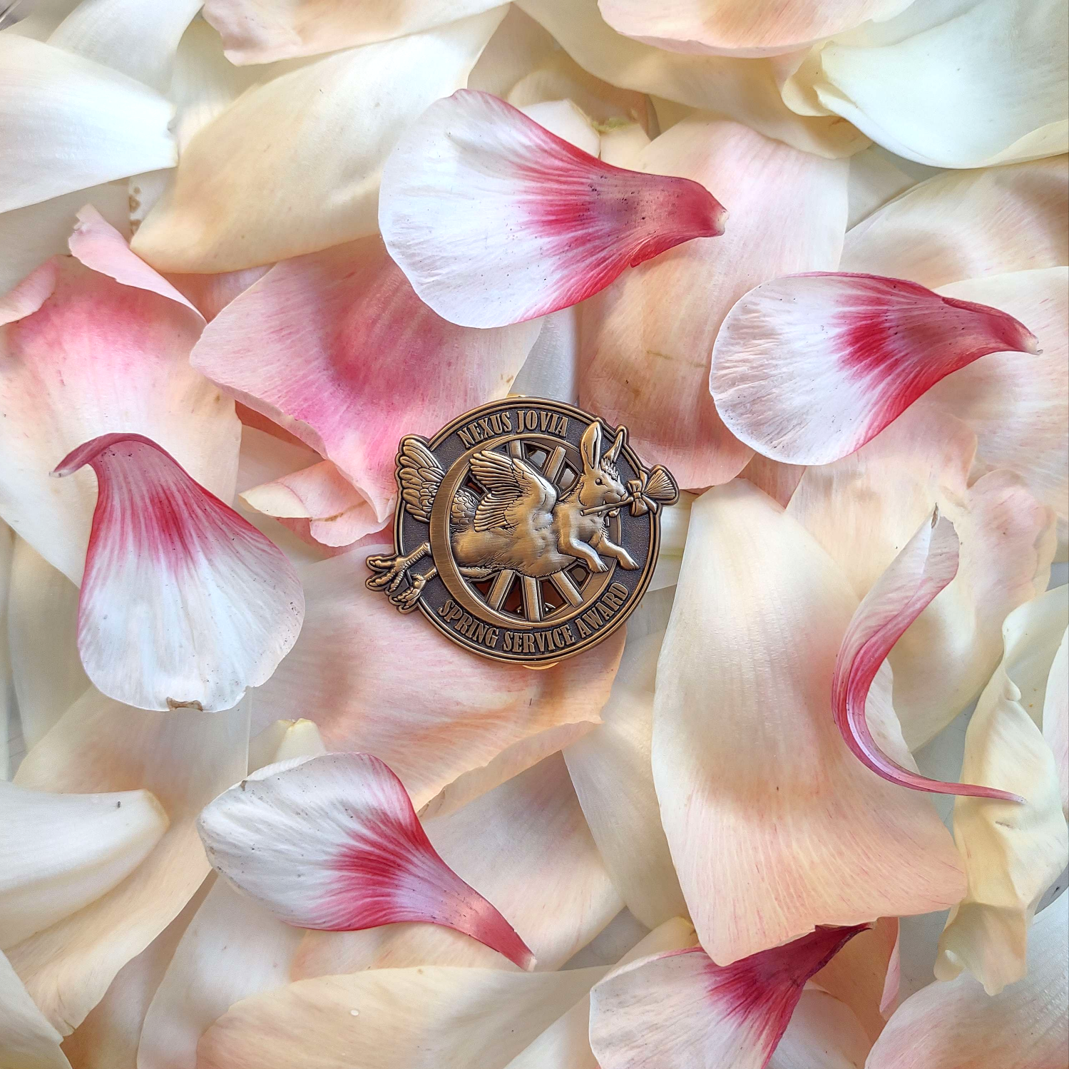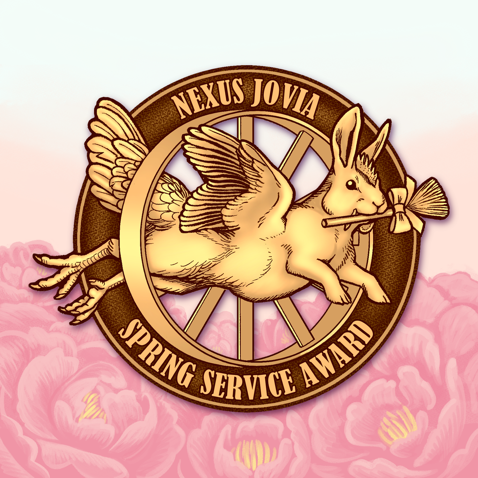 A pin styled after tokens of appreciation given to Jovian citizens for their service in refreshing the biosystems of Nexus Jovia during Spring Cleaning Week. It features two prominent national symbols of Jovia, a chabbit and a wagon wheel. The chabbit holds a broom in its mouth as a representation of the maintenance week and its following holiday, Feaster.