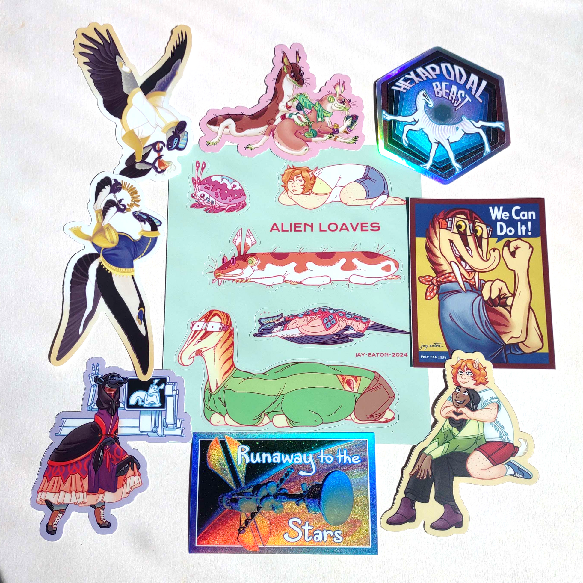 Miscellaneous vinyl stickers depicting characters from Runaway to the Stars.
